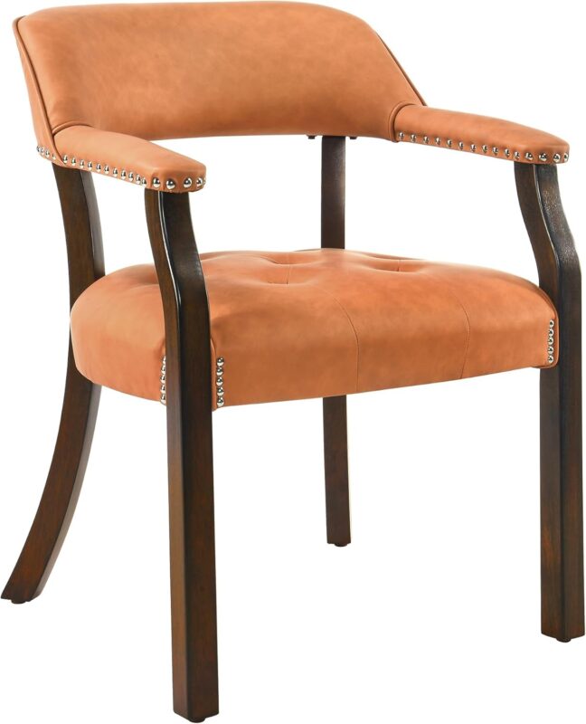 Tattva Woods Arm Dining Chairs with Upholstered,Office Desk Chair with Arms and Metal Rivets. PU Boss Captain’s Chairs,Classic Accent Stools for Dining Room, Bedroom Brown Legs & Orange NX173-318OR