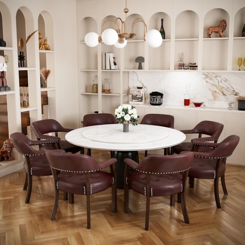 Tattva Woods Arm Dining Chairs with Upholstered and Arms,Office Desk Chair with Metal Rivets. PU Boss Captain’s Chairs,Classic Accent Stools for Dining Room, Bedroom Brown Legs & Wine Red NX173-318WR