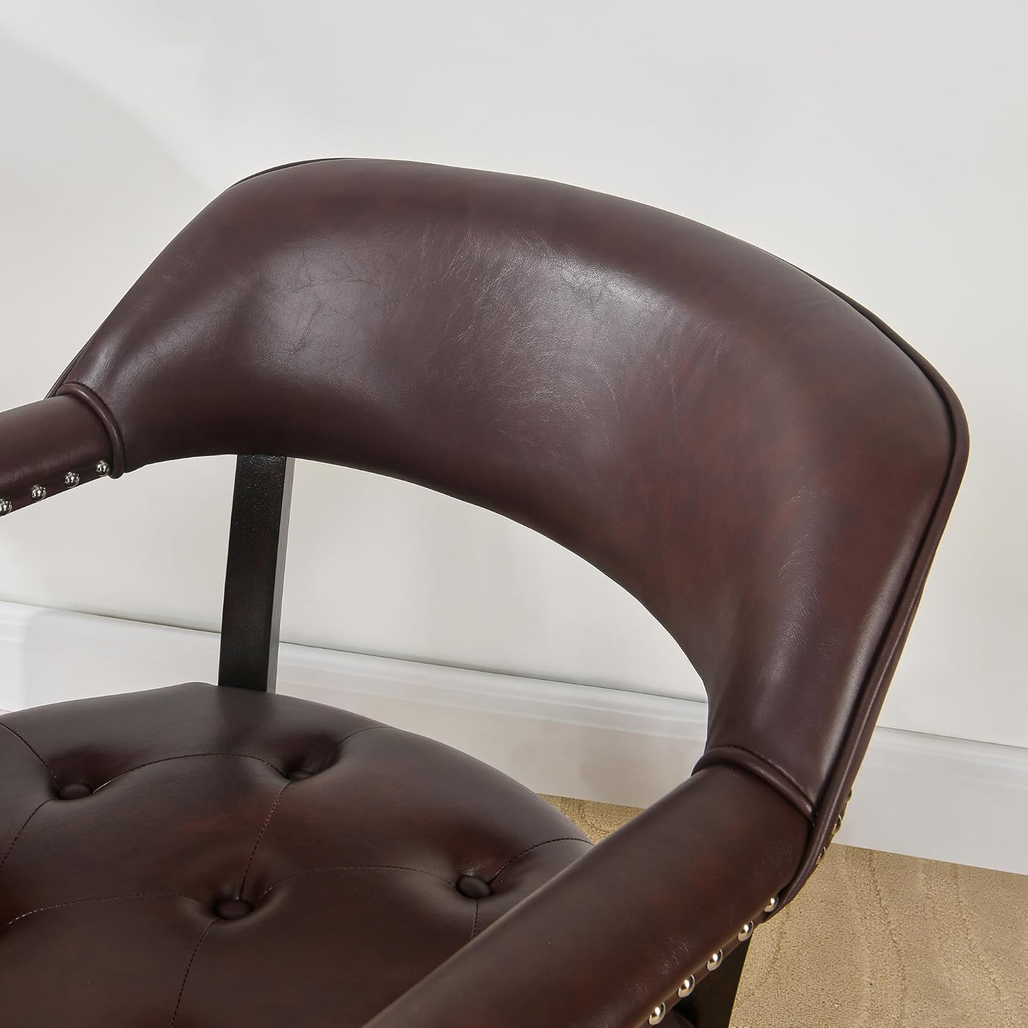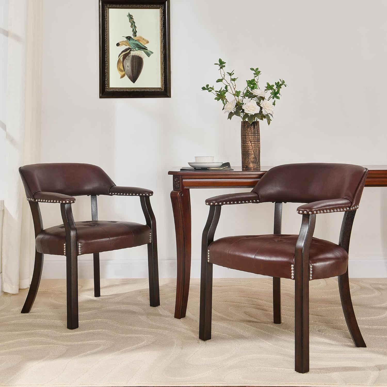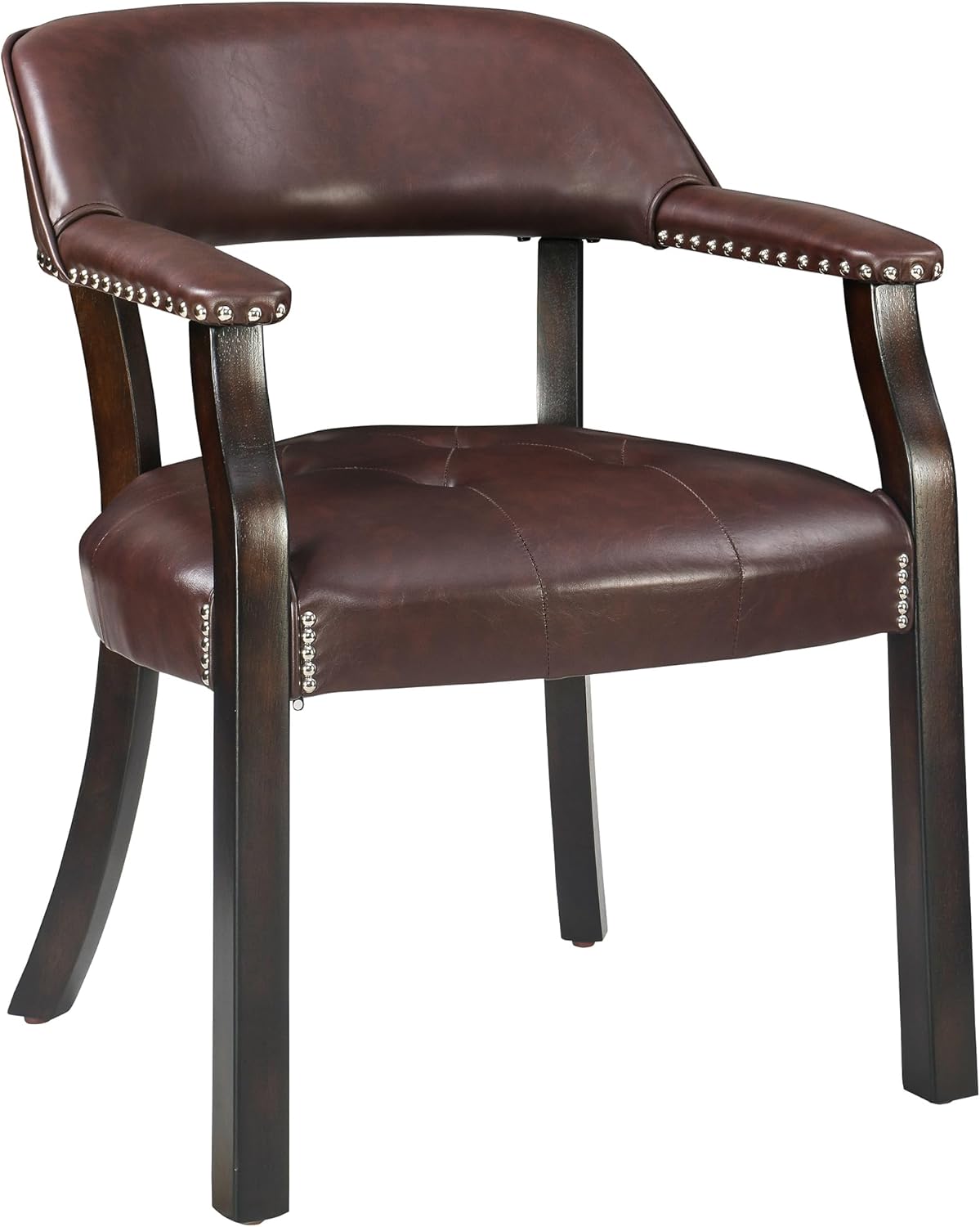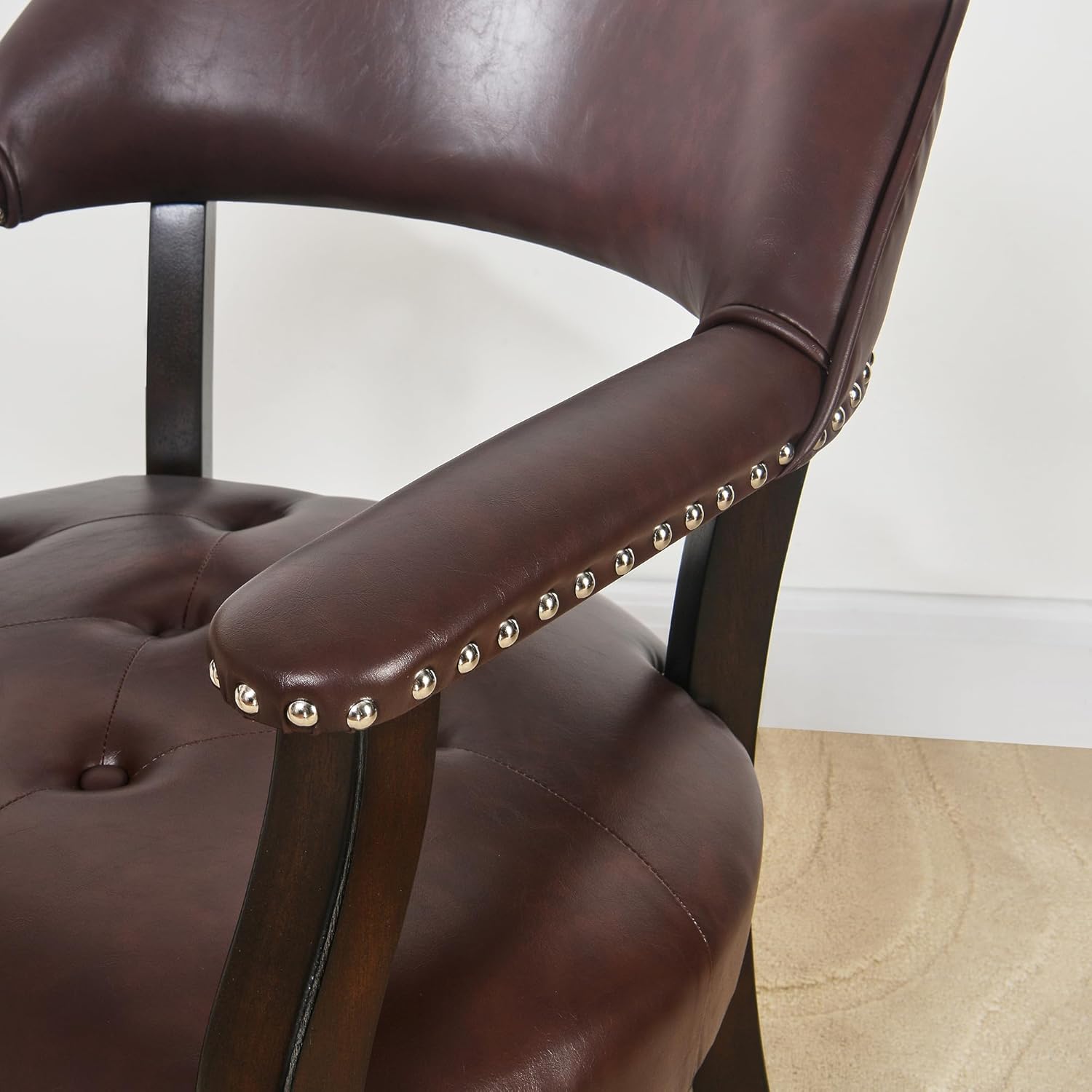 Tattva Woods Arm Dining Chairs with Upholstered and Arms,Office Desk Chair with Metal Rivets. PU Boss Captain’s Chairs,Classic Accent Stools for Dining Room, Bedroom Brown Legs & Wine Red NX173-318WR